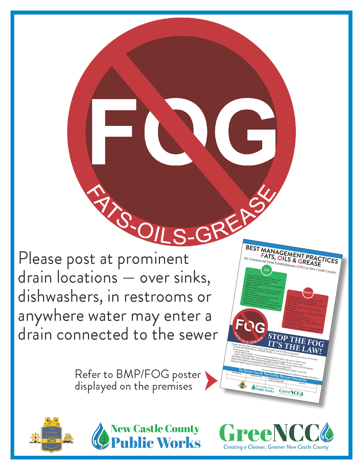A collection of pieces developed for the FOG (Fats, Oil, and Grease) program. These pieces were revamped and developed for use by Commercial Food Establishments in New Castle County, DE to help prevent FOG events such as sewer blockages that can result in damage to homes, pollution of local waterways and groundwater, and harm to fish and wildlife habitats. The collection included a Guide to FOG Management booklet, a 12×18 poster, and a FOG Sink Sign.